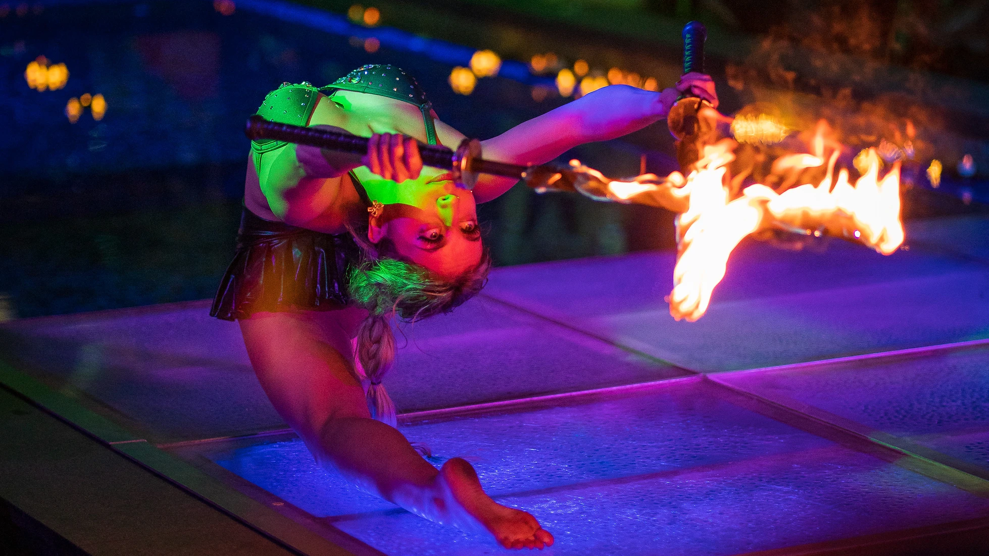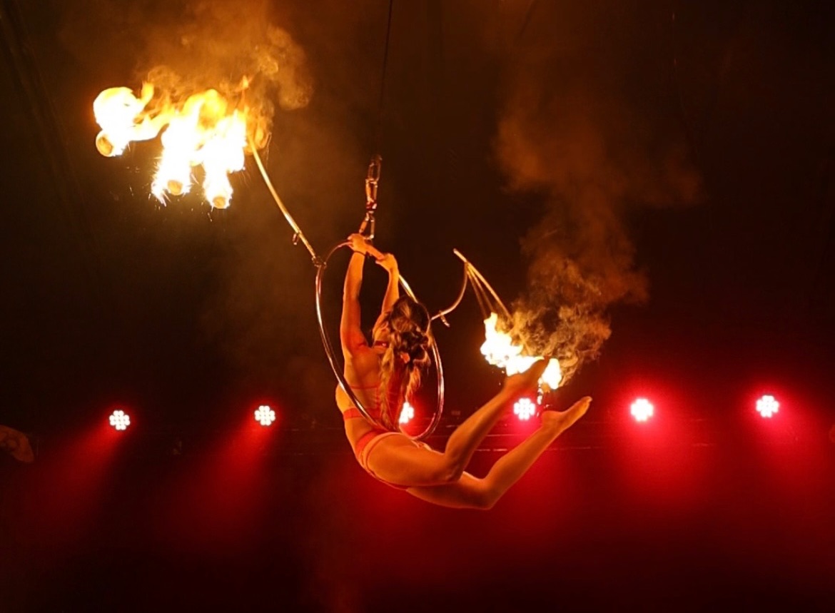A high impact fire performance combining Fawn's specialty Aerial Fire Lyra and multiple fire props. This act is designed to build intensity, layering movement, danger & visual power that commands attention and leaves a lasting impression.
